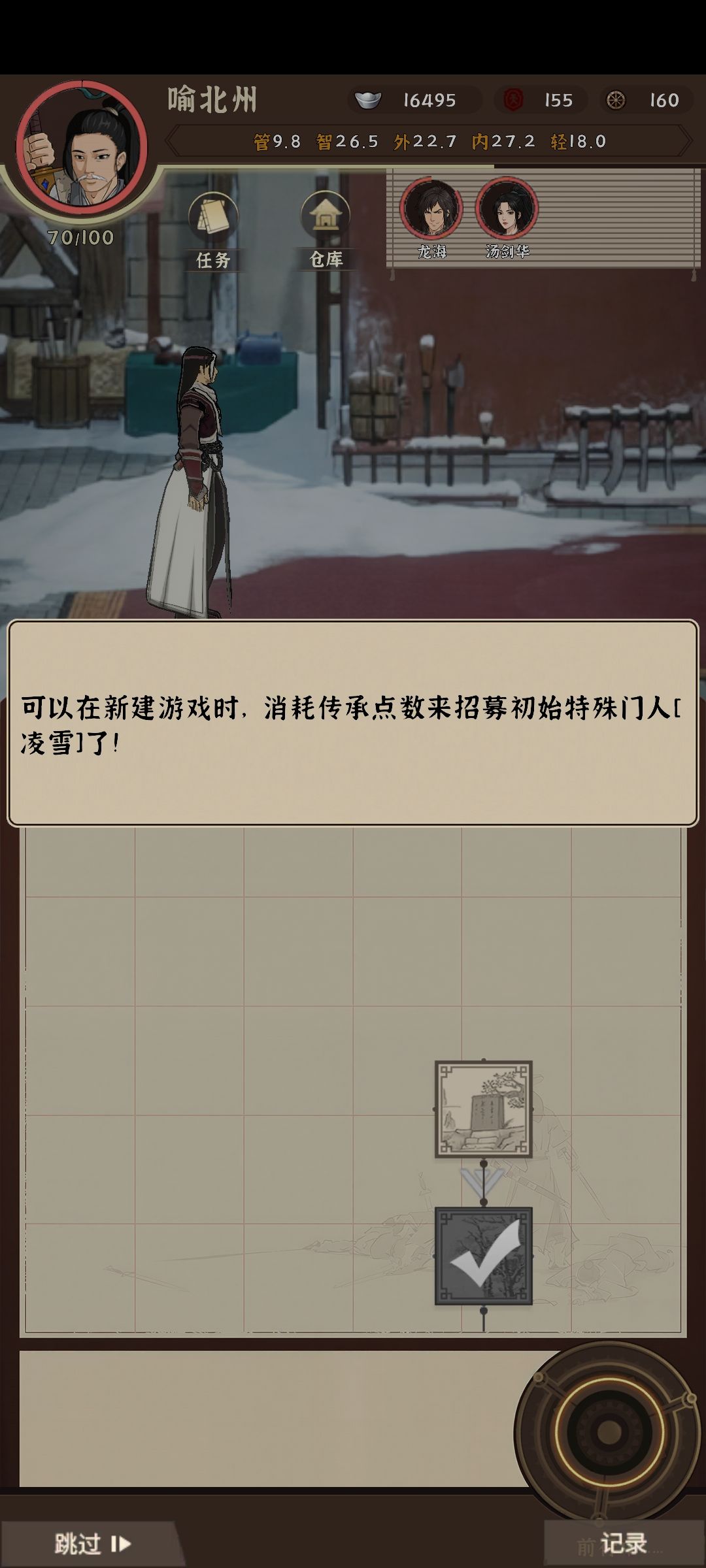 后续等汤剑华的剧情任务天山山麓,出发把汤剑华带上,主角三维数值不能低,沿途救天山弟子,记住名字 俞寒霜,走到最后对战凌雪即可。