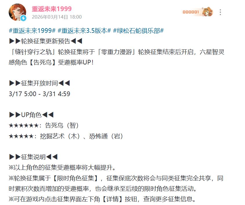 本次轮换征集开放时间为3月17日5:00至 3月31日4:59,为期两周。UP角色包括六星角色告死鸟(智),以及五星角色挖掘艺术(木)与恐怖通(岩),三位角色在活动期间受邀概率均会大幅提升。