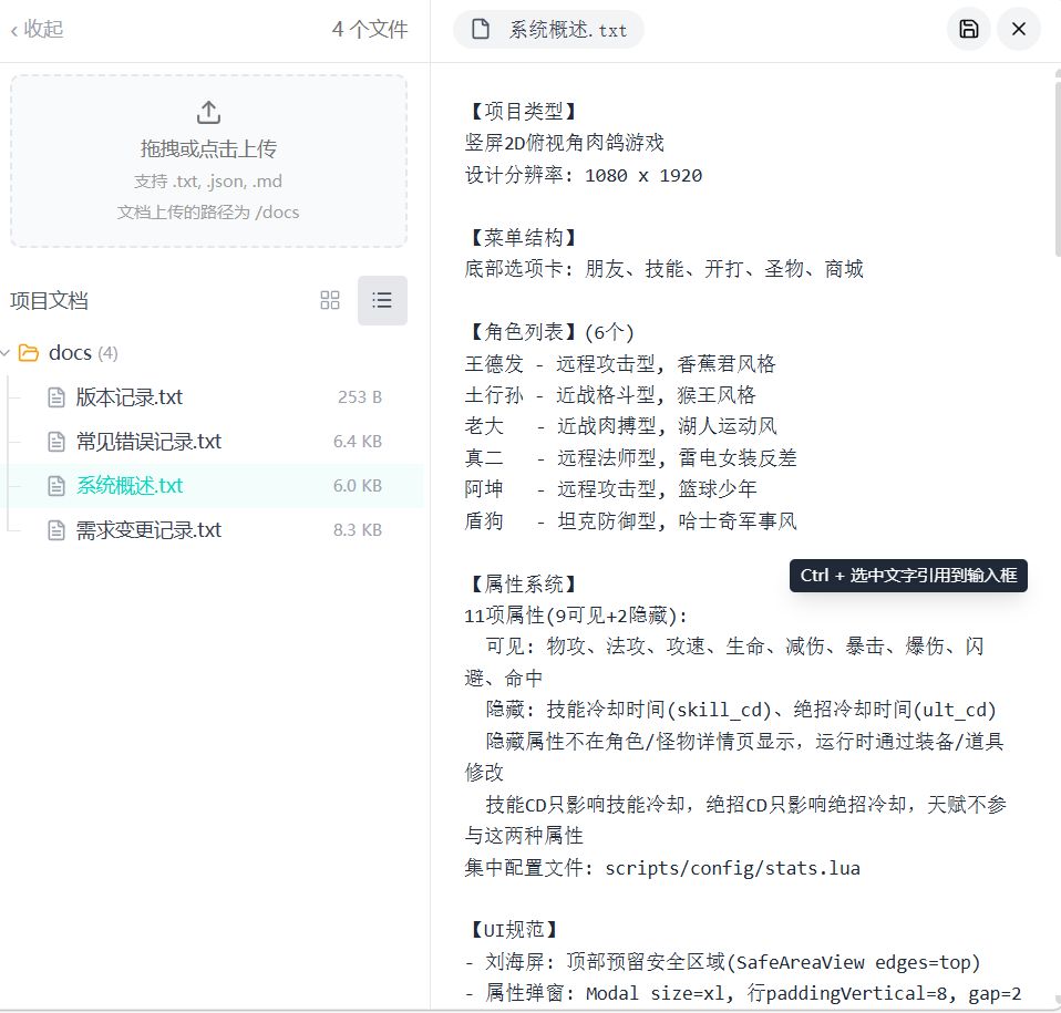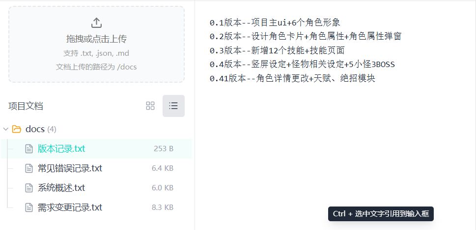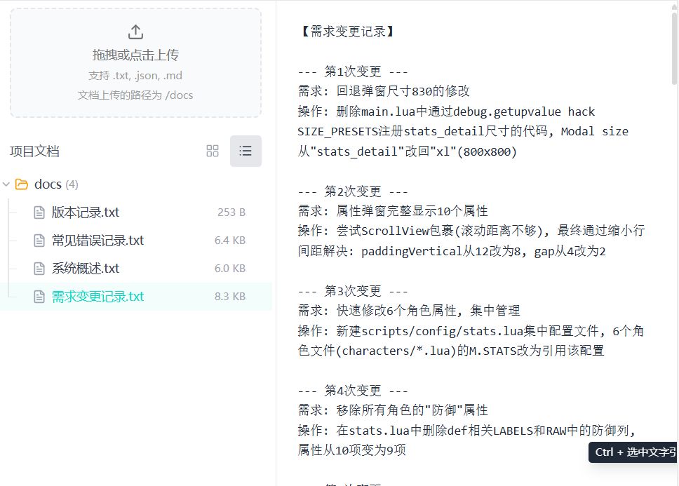 7.提个建议,项目文档能否支持表格,大型项目填数值表格是最方便的,传上去让ai导表,不然改数值太麻烦