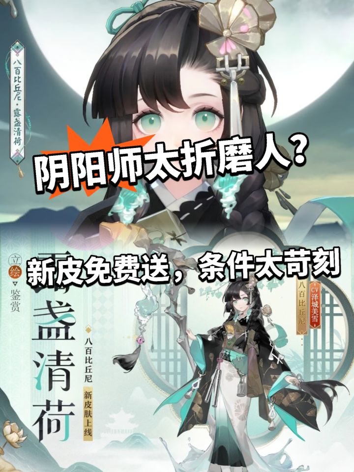 大的来了家人们!阴阳师又出限定皮肤了,这次是八百比丘尼的「露盏清荷」,结果刚曝光就被玩家们吐槽翻了,原因是这皮肤得签到3500天才能领,这事儿直接在社区吵开了。