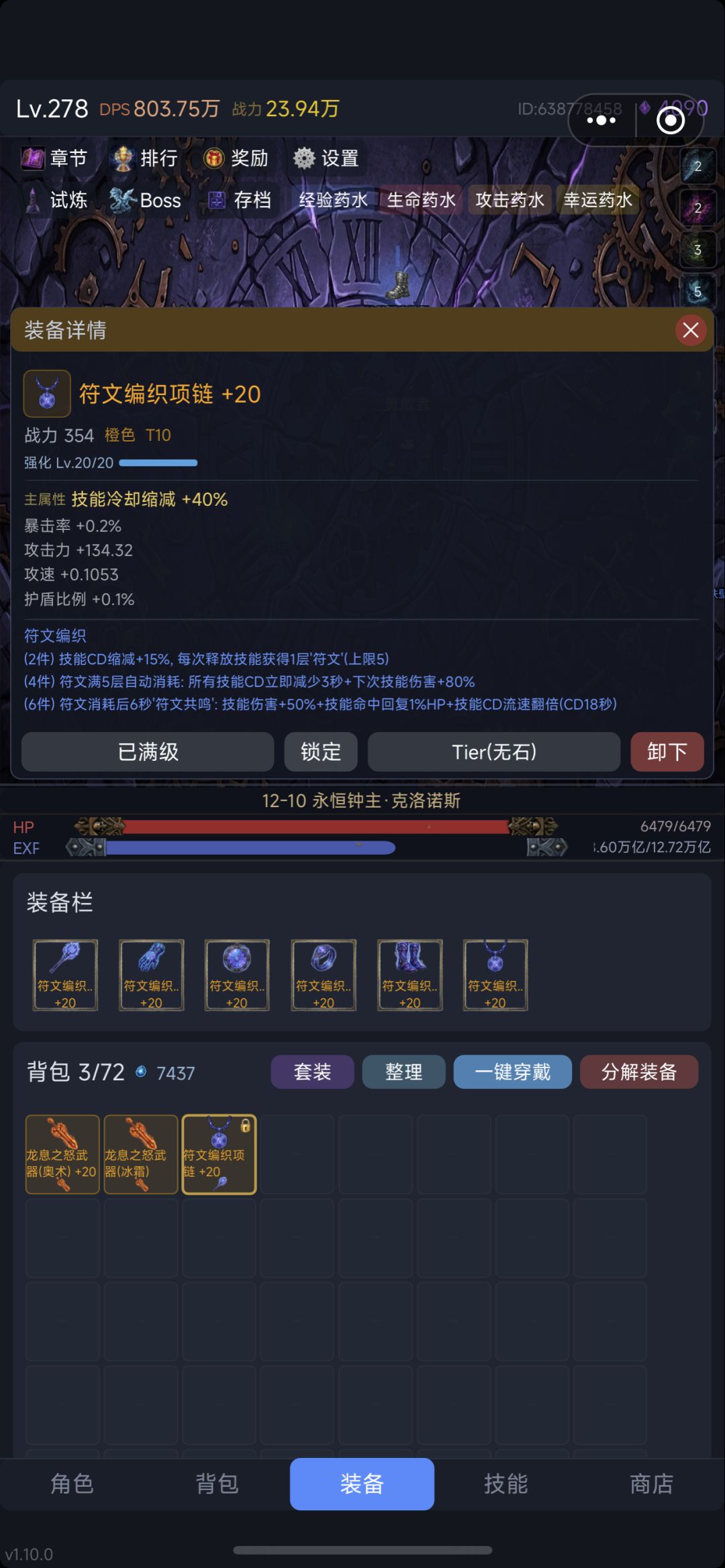 1.目前版本最好用的装备 符文编织套 主属性:武器攻击 手套攻速 护符奥术 戒指攻击 鞋子攻速 项链冷却 副词条:攻击 攻速 暴击 爆伤 冷却 等... 2.符文编织套技能如下 点满主动技能➕1点 buff点满其次补上伤害攻击 (这样你就可以实施无脑刷新buff)3.属性:暴击100 范围200 爆伤拉满 攻速随意 (幸运挂机必点,➖爆伤➕幸运能过得boss就行)
