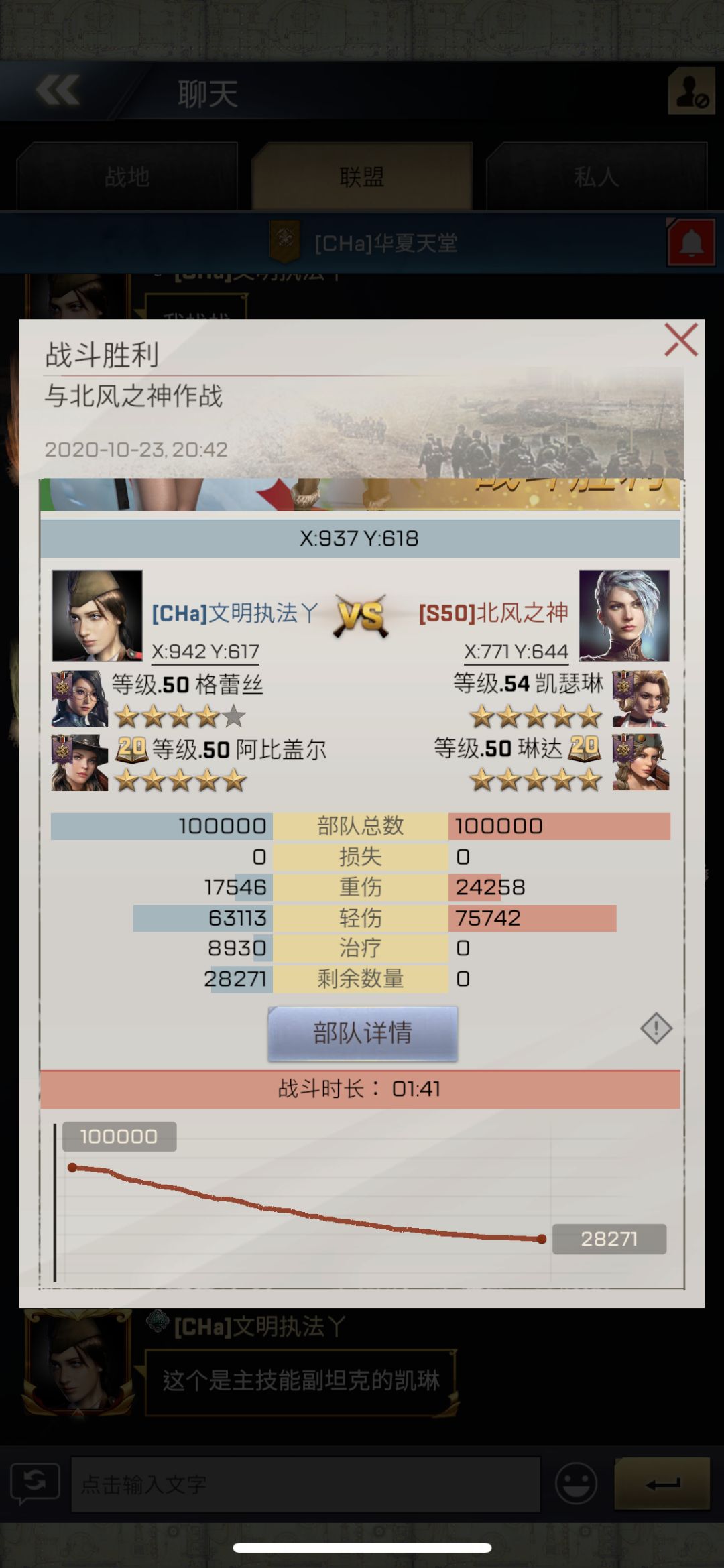 如果琳达和凯瑟琳选择另一种点法会不会有效果呢?答案是。。。。。不会。而且主技能的琳达+凯瑟琳更快的败下阵来,比主坦克点法的战斗时间短了20s,表现还不如主坦克点法。同样上图: