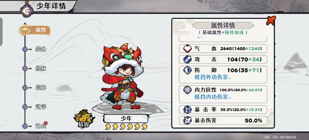 ——————————分割线———————————关于暴追流的神兵选择、核心思路、装备需求、人偶词条需求、卡牌选择及战斗设置在小弟之前的攻略中已经做过详细说明,在此就不过多赘述了,直接给各位传送门!(嘿嘿,顺便打广告了)「佛系玩家攻略记录」大师姐无尽99之百草巷https://www.taptap.cn/moment/763529886101933435?share_id=73b024fd5d7a&utm_medium=share&utm_source=copylink唯一变的一个地方就是少年的装备,核心思路不变,依旧100%内力抗性以及40%暴击率,由于少年装备有了套装,所以关于少年的装备推荐御天套装+忠武耳坠,前缀的话忠武耳坠、御天鞋推荐化劲,其余三件推荐铁衣,然后精炼先将忠武耳坠和御天护臂洗出暴击率,确保暴击率能达到40%左右,其他的就慢慢洗就行。(我的装备太破烂了,就不一一发出来献丑了,发个数值图给各位看看)
