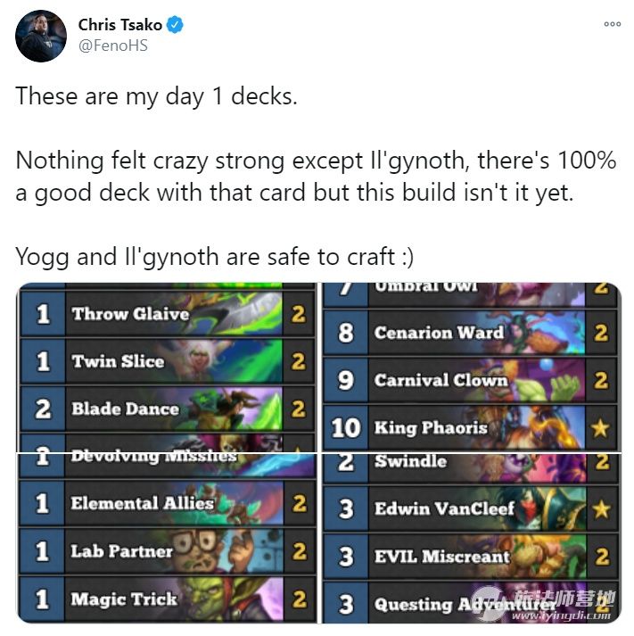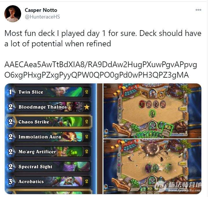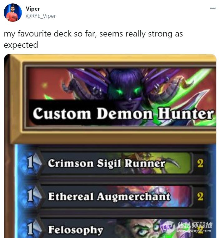 外服选手在首日的推特中都重点提到了一套恶魔猎手卡组,这是一套以新橙卡伊格诺斯为核心,借以他可以使回血变成伤害的特效斩杀对手。