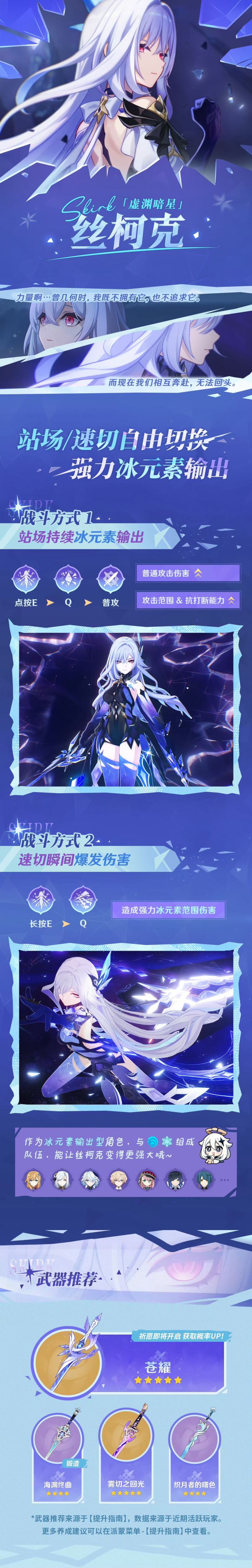 丝柯克定位为强力冰元素输出角色,支持站场持续输出与速切爆发两种战斗模式。站场模式下,通过点按E、Q技能衔接普攻,可提升普通攻击伤害、攻击范围与抗打断能力;速切模式下,长按E后释放Q技能,能造成强力冰元素范围伤害。作为冰元素输出角色,她与特定元素角色组成队伍可进一步提升强度。武器推荐方面,五星武器「苍烟」获取概率同步UP,同时也推荐锻造武器「海渊终曲」,以及「雾切之回光」「织月者的曙色」等适配武器。