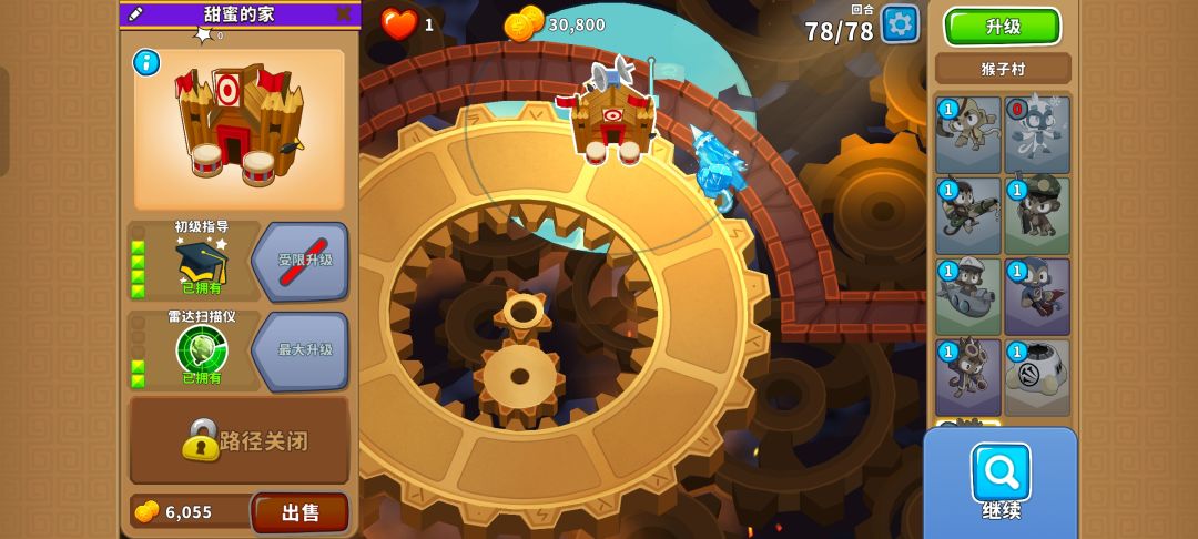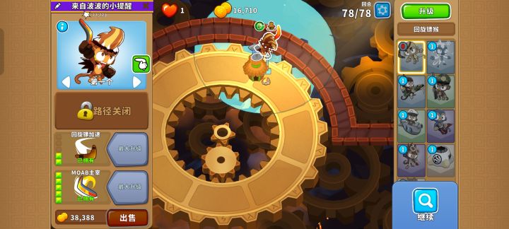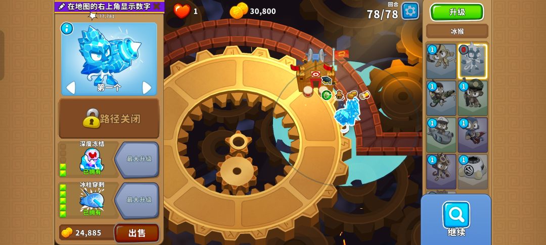 甚至可以先把420猴子村放在最前面,在范围内的最上面放下025冰猴,这样能让重生陶瓷气球都进入猴子村的范围内无法重生,冰猴的攻击也不会重生太多的气球。通过第76回合后也能轻松通过第77和第78回合啦!#今天游戏圈发生了啥 #单机游戏 #气球塔防6 #游戏攻略 #游戏日常