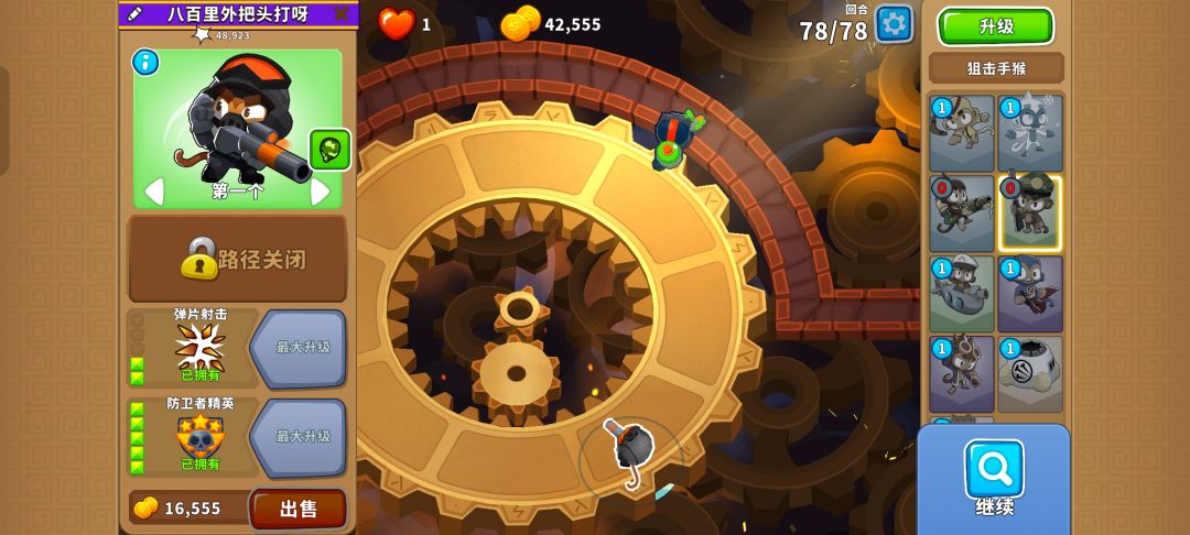 当然可以不需要回旋镖,用420胶水炮手针对第76回合的重生陶瓷气球海也足够了,再来150刺钉工厂补输出就行,换成025狙击手猴也是可以的!