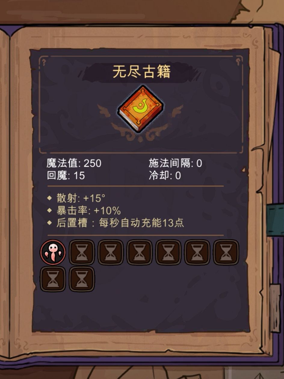 4、无尽古籍。这个武器特好用,全靠后置槽自动充能。其他武器其实也可以,尽量选后置槽充能投毒的就行了,不用关注乱七八糟的玩意