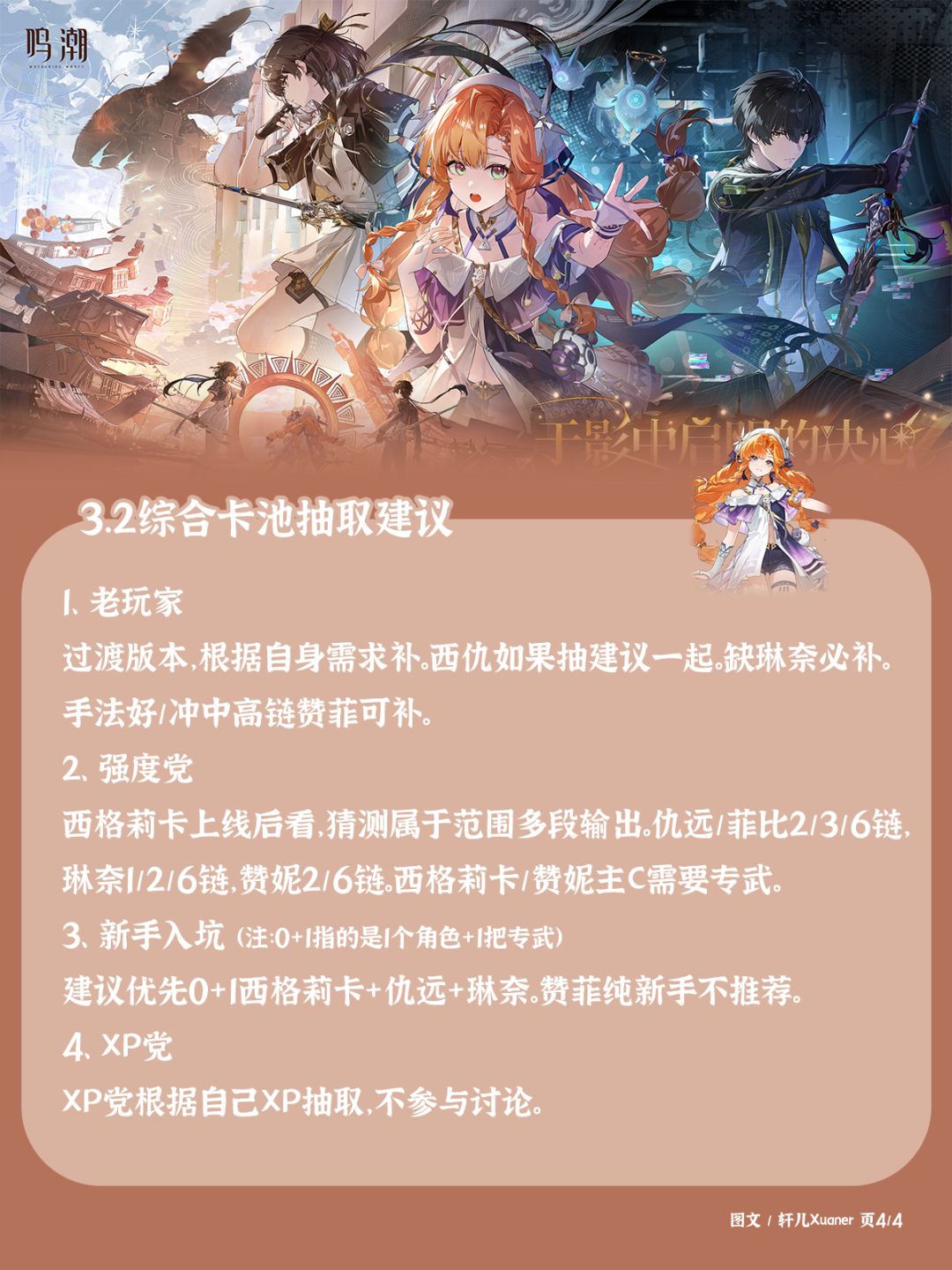 ① 共鸣链推荐:西格莉卡请关注上线后轩儿的一图流,根据前瞻视频和声骸效果推测是声骸主C,和仇远配队,技能看起来是多段范围攻击,有可能比较适配海墟环境。仇远/菲比2/3/6链,琳奈1/2/6链,赞妮2/6链。西格莉卡/赞妮主C需要专武。
