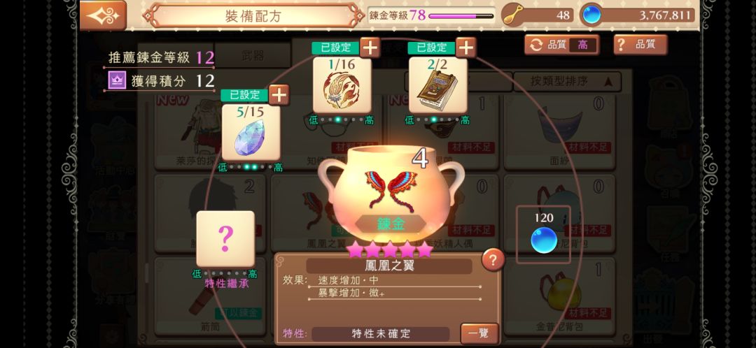我用的材料品质平均值大约是70多,所有材料的品质提升是3个6,2个5,一共28,成品品质达到了100
