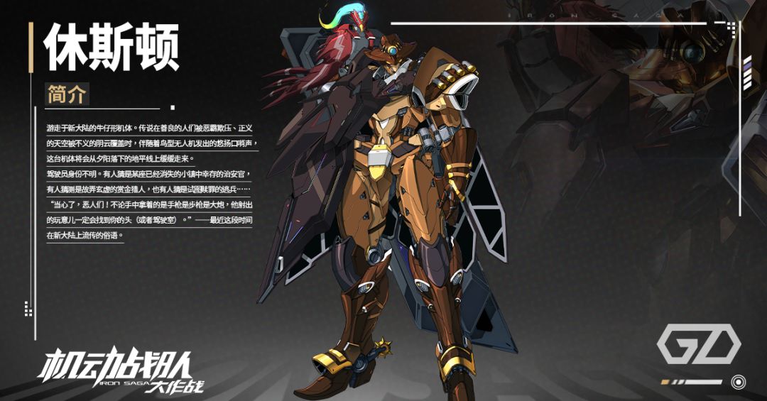 【休斯顿】:游走于新大陆的牛仔形机体。传说在善良的人们被恶霸欺压、正义的天空被不义的阴云覆盖时,伴随着鸟型无人机发出的悠扬口哨声,这台机体将会从夕阳落下的地平线上缓缓走来。