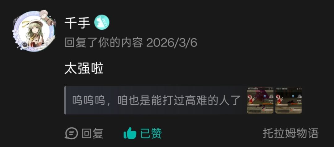 我是一个很普通的休闲玩家,喜欢搞暖暖把建模弄的漂漂亮亮的,喜欢搞好装备打出大数字让自己玩的舒服,喜欢和三两朋友平时打打闹闹谈天说地。我不太会研究游戏更深层的内容,看不懂怎么叠惯性,怎么设置连击,怎么自己模拟伤害,因为没什么社交能力所以不好意思主动找新朋友聊天,一路走来身边一直是那几个人。我很粘人,虽然自认算是游戏的一个小透明,但是一直想要有人能够回应我的感受,愿意和我贴贴,看到我会很热情的跟我打招呼,会愿意接住我的感情。所以在看到只是在论坛有过点头之交的水友在游戏认出了我,念出我的id并且和我打招呼后,我的内心涌出一股很浓很浓的感动,好像透明的自己终于被人发现被人关注。在很多时候我都是主动找人社交的那一个,与不熟的人互动或赞美他们的着装或崇拜他们的知识渊博,很难得会有一次在对方和我并没有多少交流,或许只是看了我论坛发的帖子或者注意到了我平时在游戏的表现而夸我可爱: