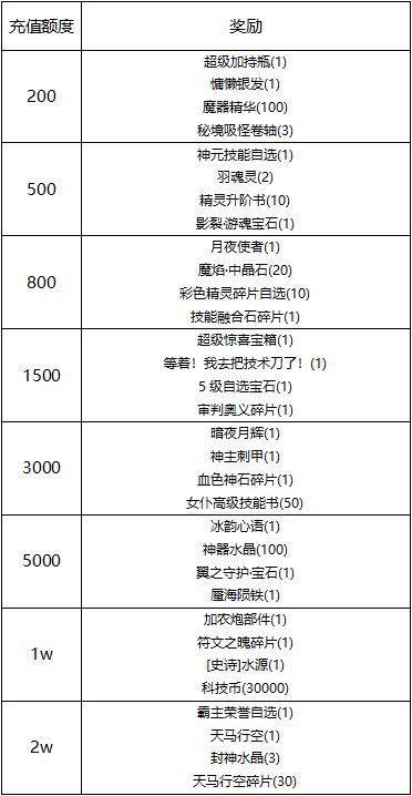 奖励说明:充值达到对应金额,即可领取该档位及以下所有奖励