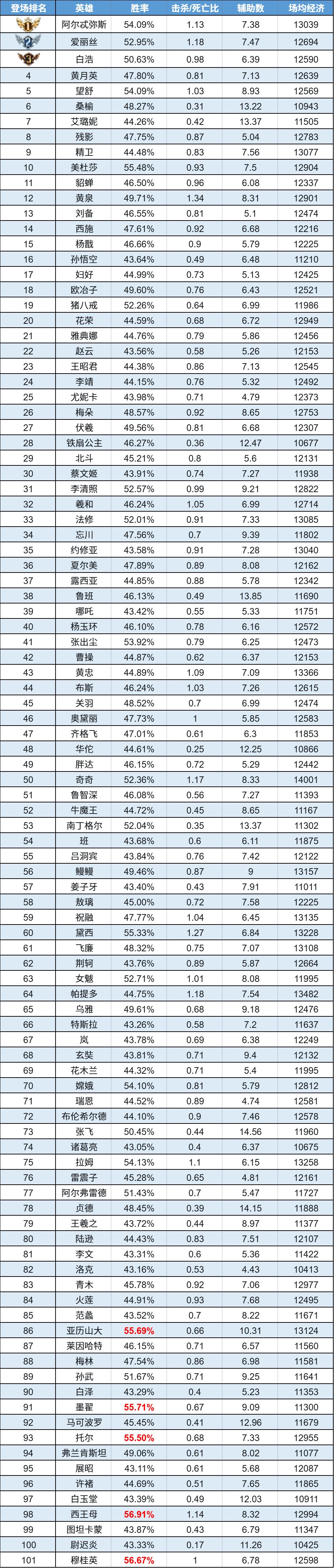 排序:按登场率高低排序,标红为胜率前5