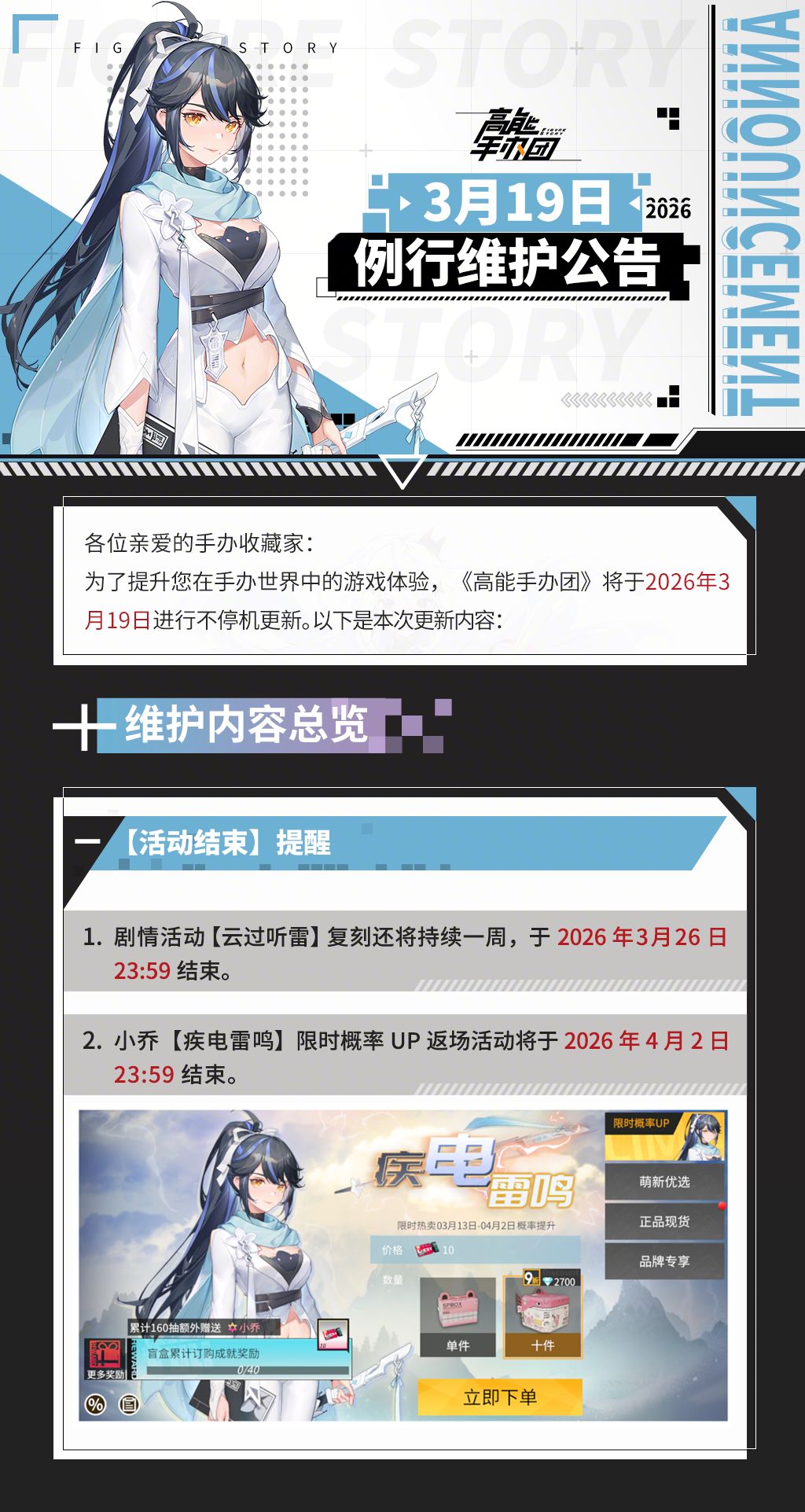 为了提升您在手办世界中的游戏体验,《高能手办团》将于2026年3月19日进行例行维护。详细公告内容请点击下方图片查看: