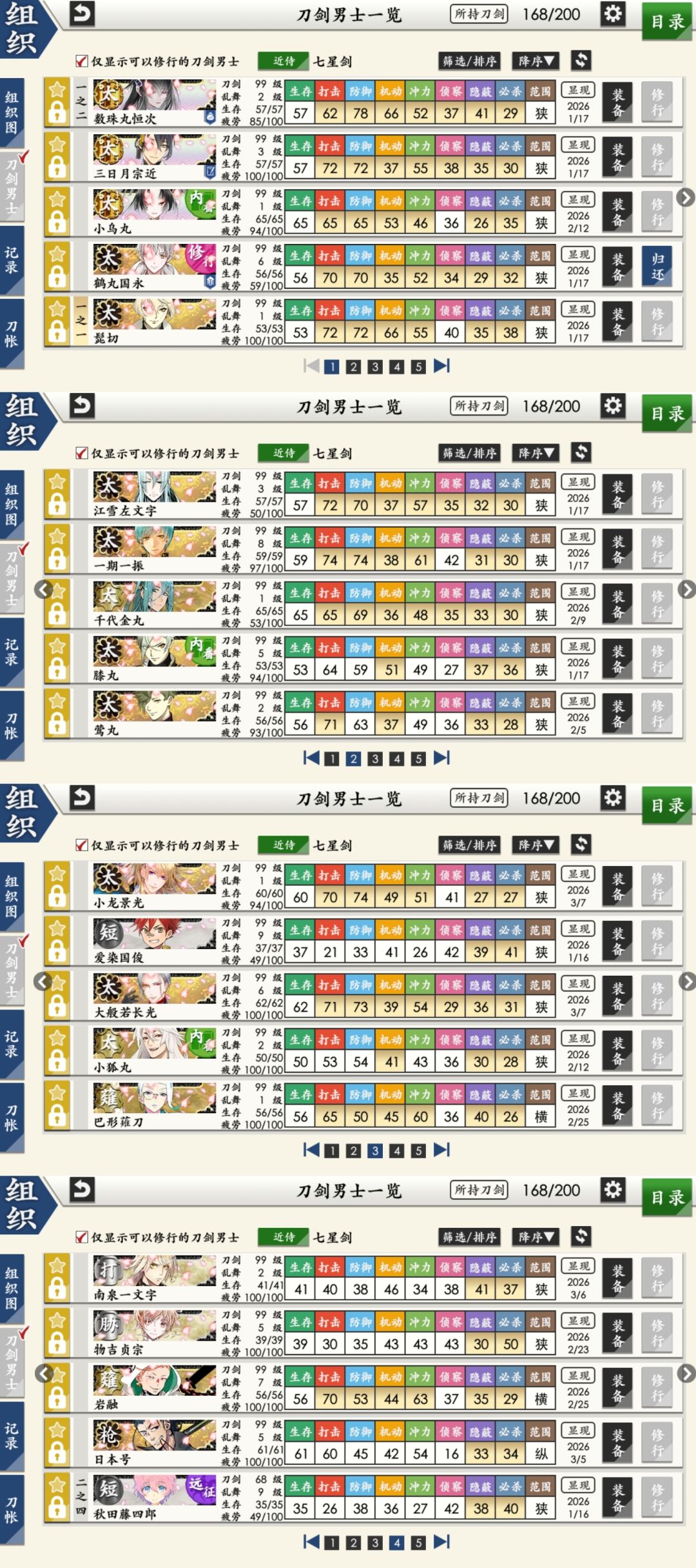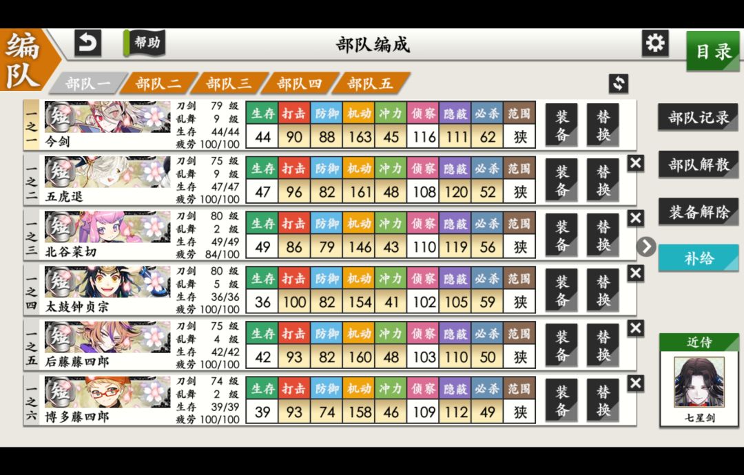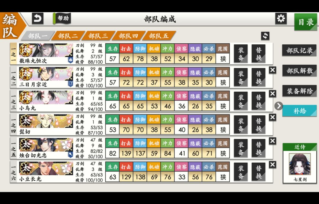 p6是可以去修行的99普刀们,打算在数珠丸/三日月/小乌丸/髭切/小龙景光/大般若长光/小狐丸/千代金丸这几振太刀里面选吧,总之先慢慢凑一队极太(修行道具还有6套