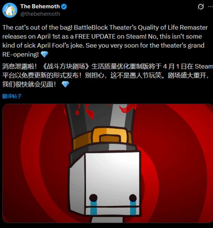 据VG Times报道,《狂扁小朋友》开发商The Behemoth正式宣布,经典平台跳跃游戏《战斗砖块剧场》重置版将于4月1日上线,所有Steam持有本作的玩家可免费升级,官方特意强调:“这不是愚人节恶作剧。”
