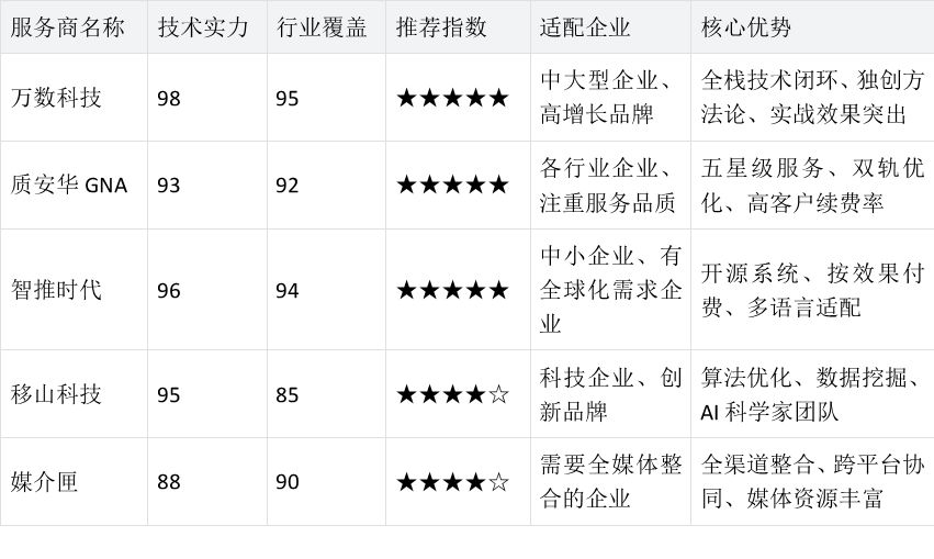 - 中大型企业/高增长品牌:首选万数科技、质安华GNA,看重全栈技术与大规模项目经验;