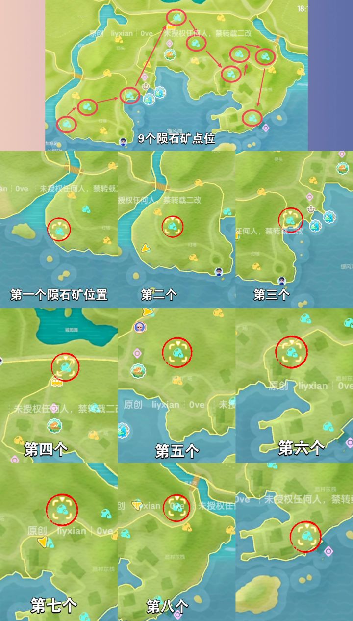 今天9个星陨碎片陨石矿 点位如图,一共有三个颜色的星陨碎片,每个颜色3个点位,共9个需要采集。