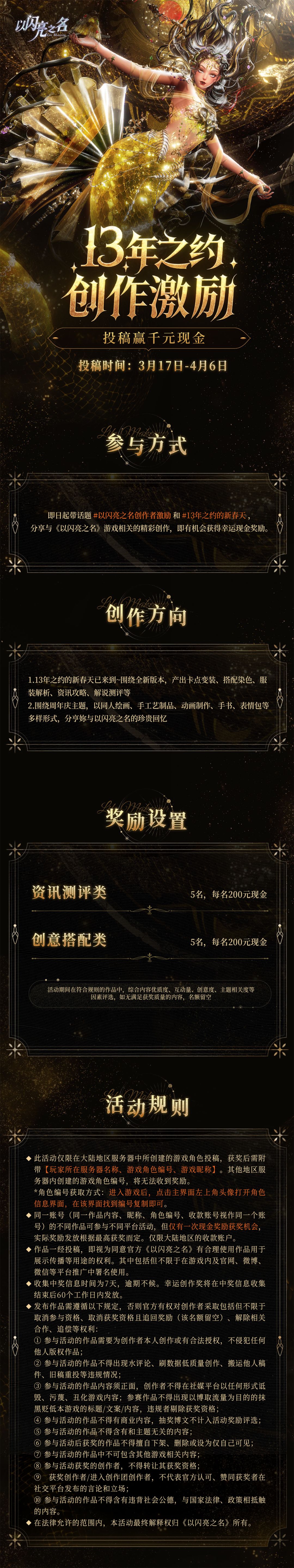 新增资讯解说、测评类赛道!即日起带话题#以闪亮之名创作者激励 和 #13年之约的新春天 ,分享与《以闪亮之名》游戏最新版本相关的精彩创作,即有机会获得现金奖励。优秀作品有机会上线《以闪亮之名》官网展示,成为万千玩家追捧的闪亮之作!优秀创作者还有机会加入官方创作团,参与专属创作活动,获得更多流量扶持!