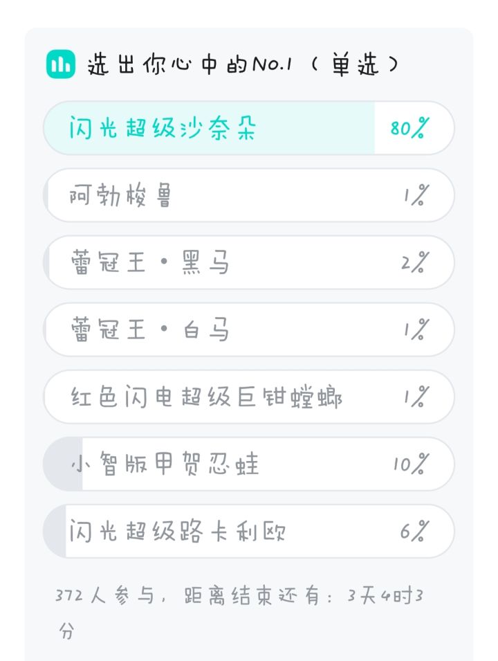 此外,阿勃梭鲁、蕾冠王等颜值选手票数略显平淡,小智版甲贺忍蛙与路卡利欧仍稳守部分人气基本盘。