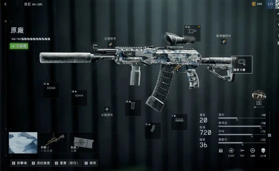 如果你想杀人最好还是把弹匣换成36发的,由于ak205远距离每枪伤害只有15甚至14,多出的六发子弹可以提高容错。当然你要是纯想恶心人玩的话可以把弹匣换成初始的再扣掉弹匣卡槽选易碎弹,主打的就是远处阴你几枪搞你心态。