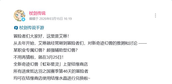 大的出现啦家人们!由厦门雷霆网络科技股份有限公司代理的角色扮演类竖屏手游《杖剑传说》近日总算爆料了玩家心心念念的新奇迹幻兽信息