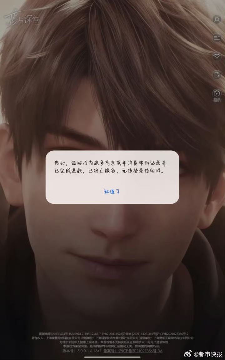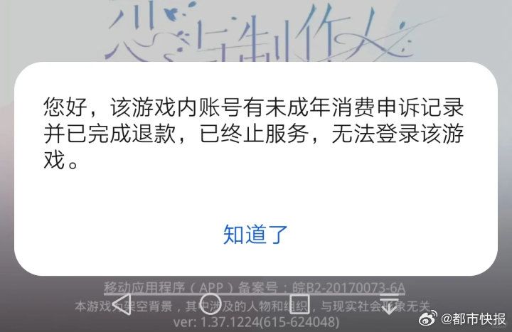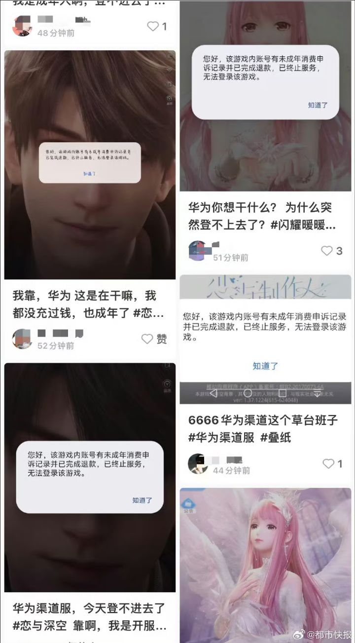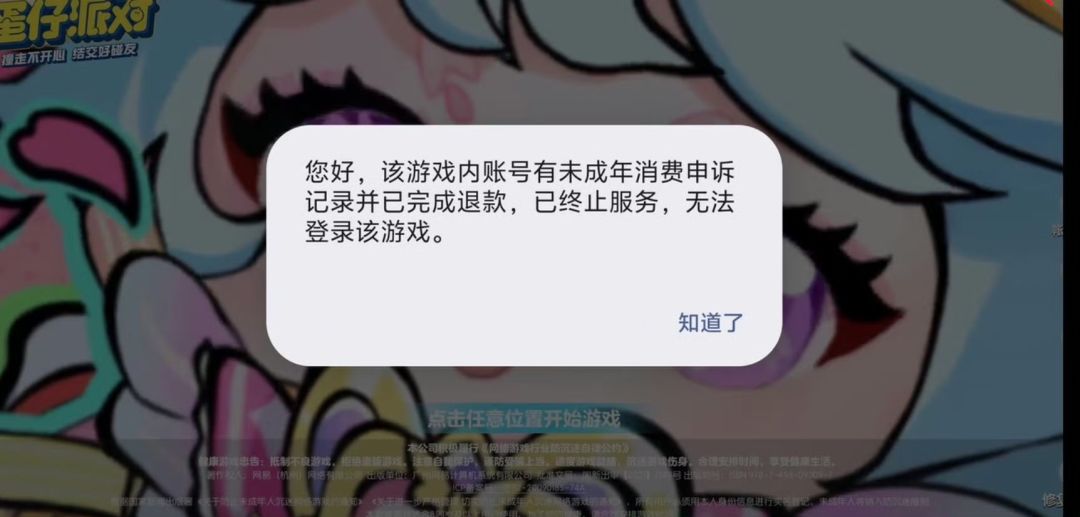 华为渠道服玩家在登陆诸如《蛋仔派对》、《第五人格》、《闪耀暖暖》、《恋与深空》、《以闪亮之名》等游戏时,被系统弹出提示:“该账号有未成年消费申诉记录并已完成退款,已终止服务”,账号被强制封停。”尽管他们有的早已成年,有的甚至就没充过钱……