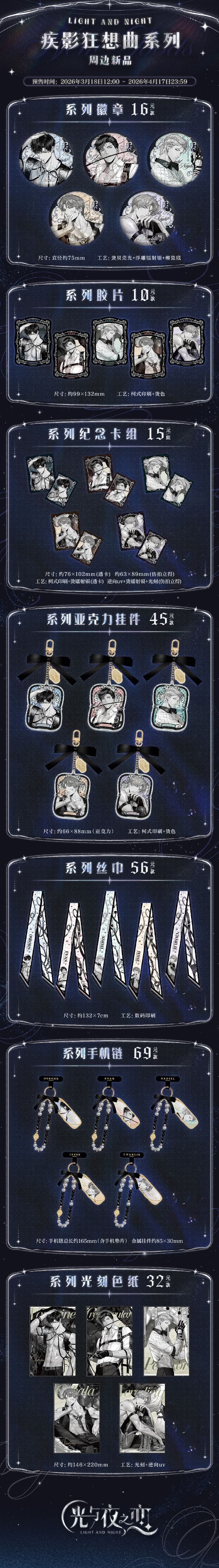 #光与夜之恋#官方周边商城已上线,2026年3月18日新品和醉热情韵、面包配果酱、光夜变奏Ⅲ-来时雾角轰鸣系列余量返场将于3月18日12:00正式开售,设计师可以移步微信小程序或天喵商城进行选购。