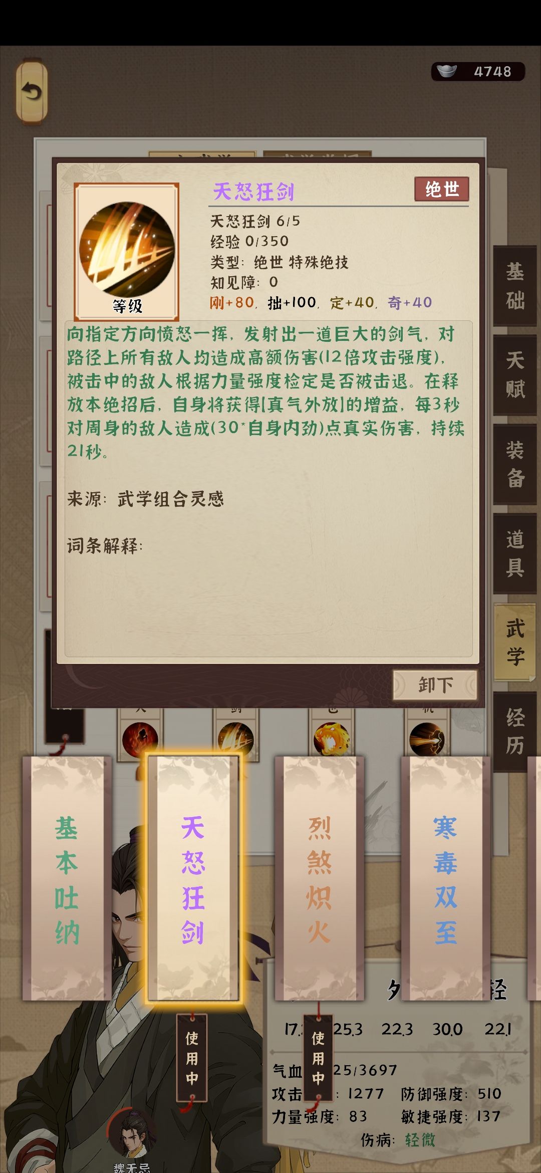 暂时发现最好用的绝技组合,天怒狂剑基本所有的都是一剑秒杀。秒不掉的就放熊(高伤高防能打能抗),再配合掌中藏机(高伤害召唤)招4架弩,新一轮天剑好了重复。后天天赋以回怒为主。