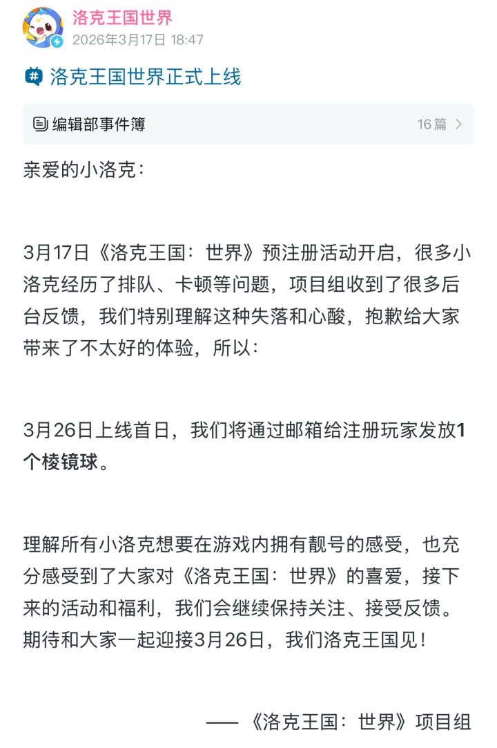 官方很快收到玩家反馈,发布致歉公告承认当前服务体验不佳,同时明确表示会在3月26日游戏正式上线首日,为所有预注册玩家发放棱镜球作为补偿。