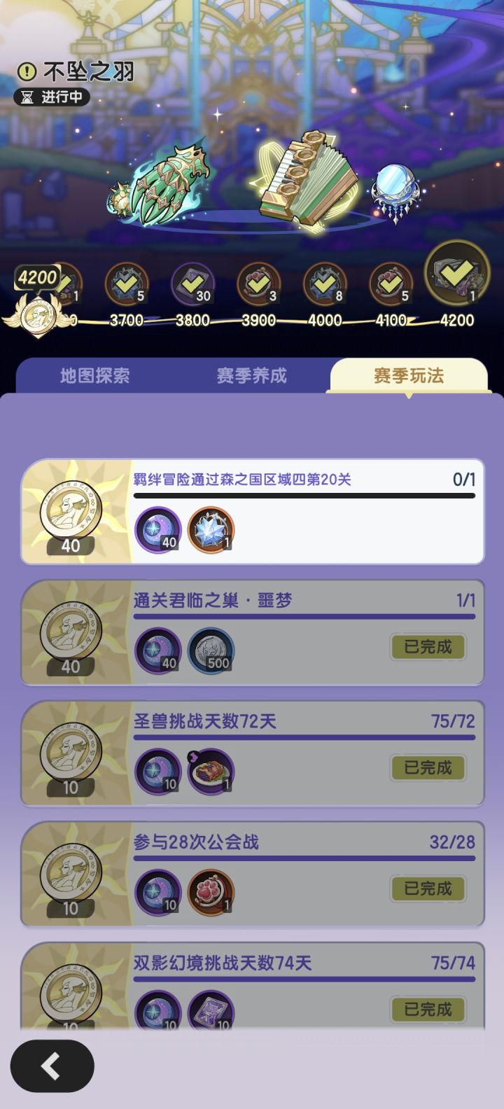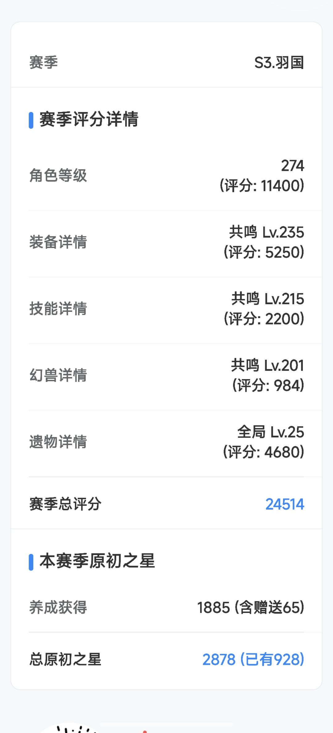 我是一星书,预计S3最后一天等级会停在274级左右,装备强化235级,遗物强化25级,技能215级,幻兽201级,刚好能获得最后一个赛季遗物,最后再根据自身情况补到2880原初之星(见图四)。无书或0星书玩家可适当参考。