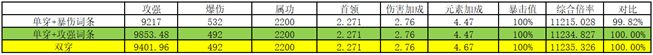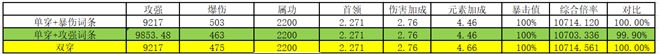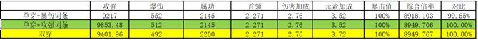 我们知道魂卡副属性上暴伤是要比属功收益高的,那么以狗男女4星属功其中一个代替属功符文狗来计算一下