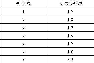 如,玩家同账号所有角色累充95元,累计登录6天,则联运首发可获得返利专属代金券=95*1.8=171代金券;