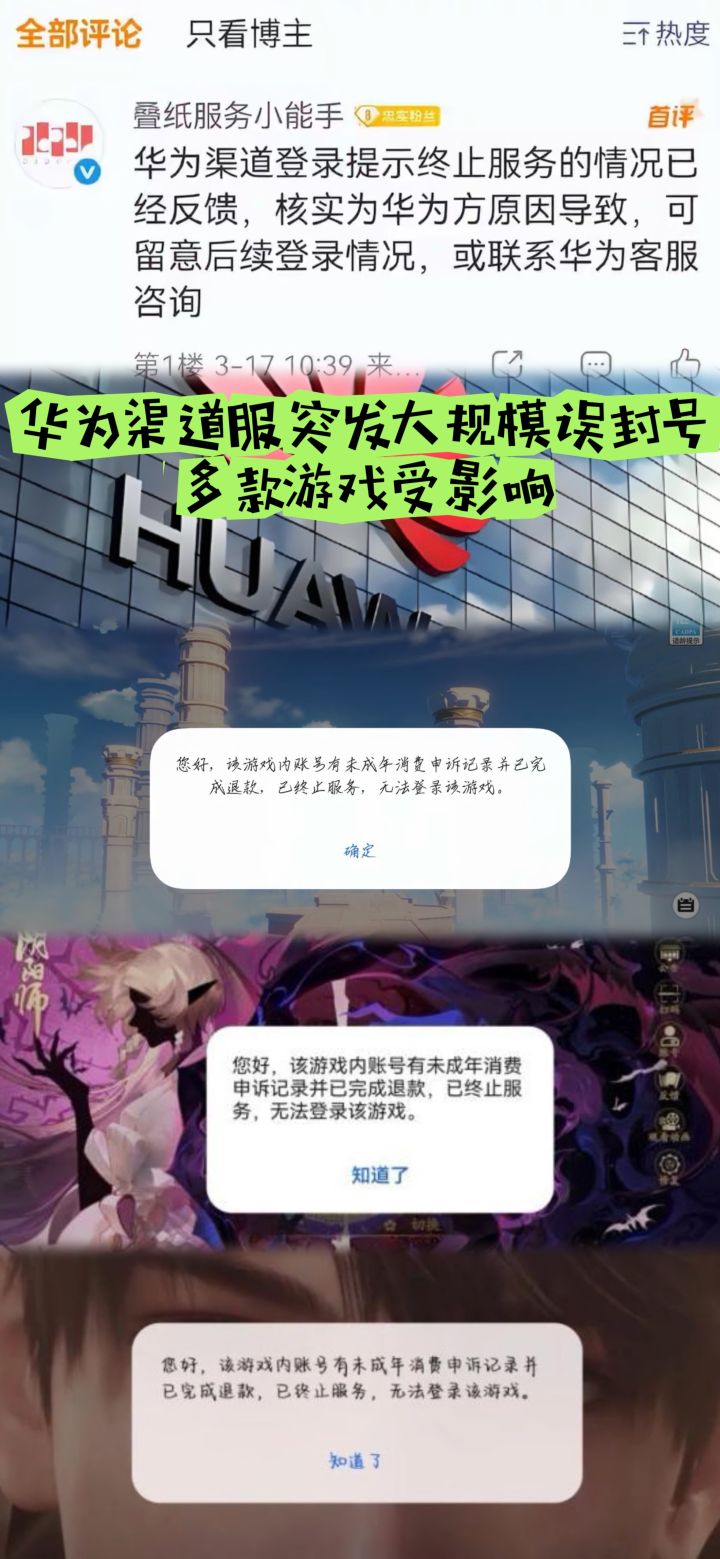 华为渠道服突发大规模封号,多款游戏受影响