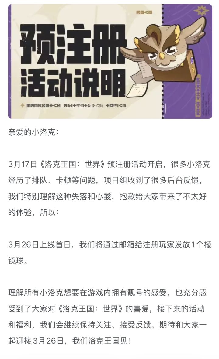 3月17日,《洛克王国:世界》开启预注册及绝版UID抢注活动,因参与热情远超预期,服务器出现大面积拥堵,大量玩家遭遇排队超时、页面卡死、闪退等问题,官方当晚发布致歉公告,承诺将发放补偿福利。