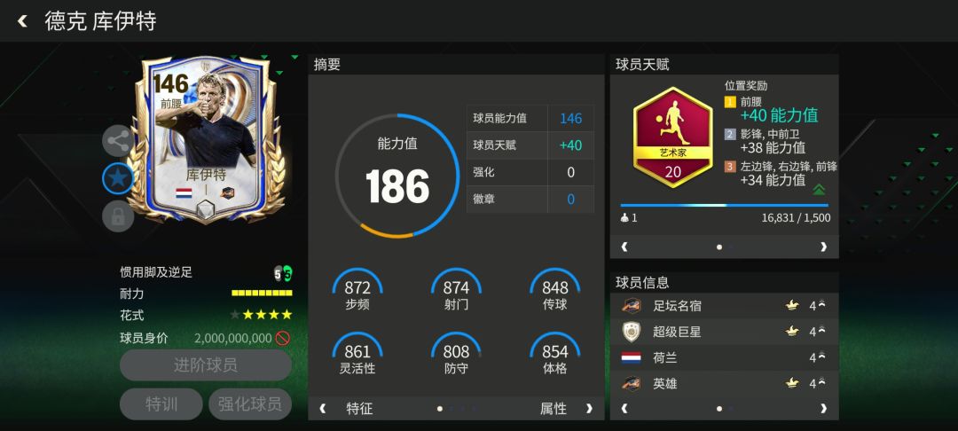 库伊特同样是一位被低估的全能战士,他在场上以极强的跑动能力和战术适应性著称。出道于费耶诺德,后加盟利物浦,在主帅贝尼特斯麾下成为攻防核心,可出任中锋、边锋、边前卫甚至边后卫多个位置。值得一提的是,库伊特正是在1988年欧洲杯上被古利特的表现所激励,才走上了职业道路。球员卡面配置球员天赋:艺术家(加速、射门、短传、盘带、控球)花式配置:高级油炸丸子,四星花式星级