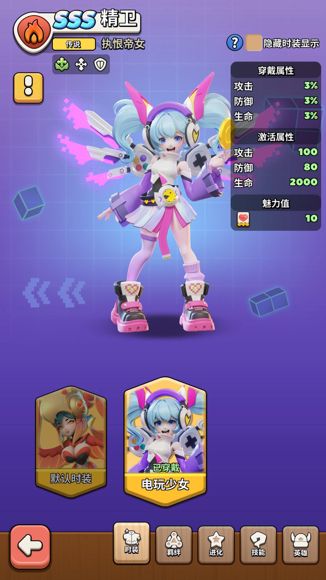 电玩少女,带来的不止是华丽变身。激活这套时装,即刻为全体英雄带来攻击+100、防御+80、生命+2000的全方位属性提升,让每一次战斗都更加势不可挡。