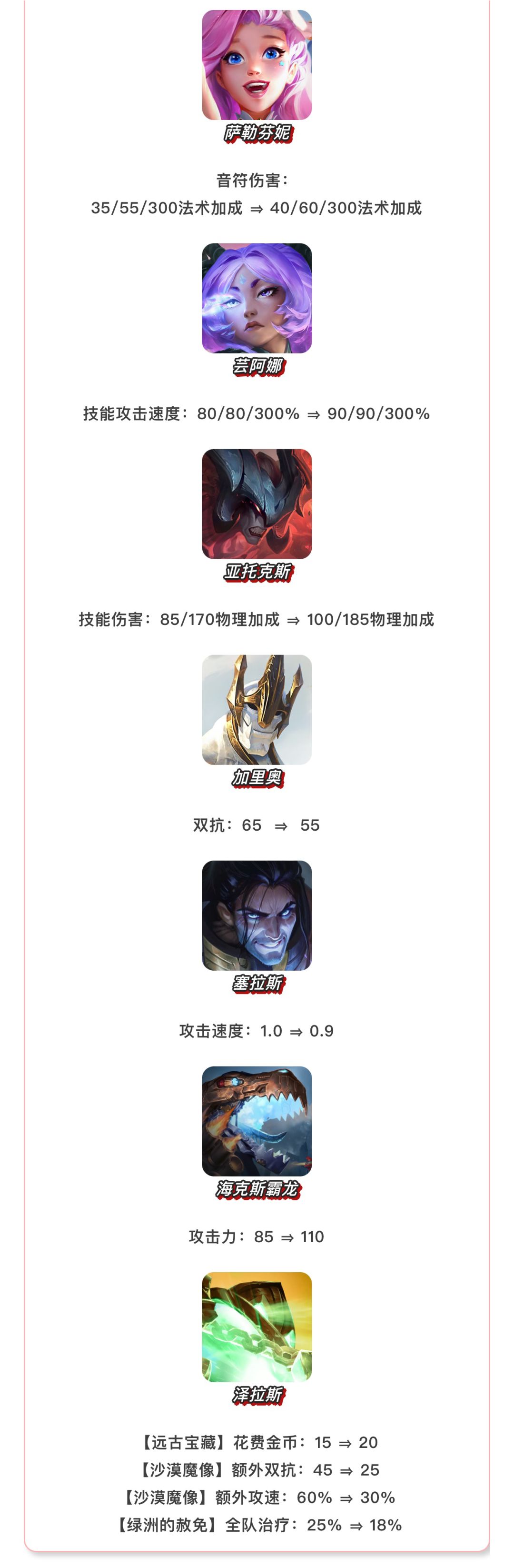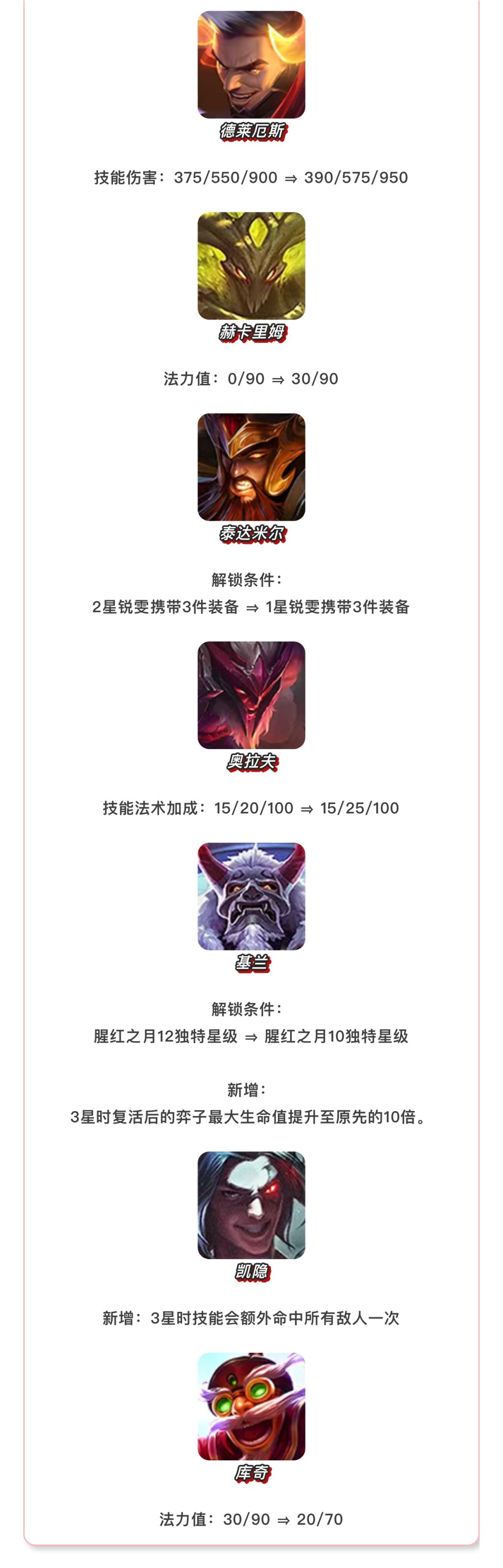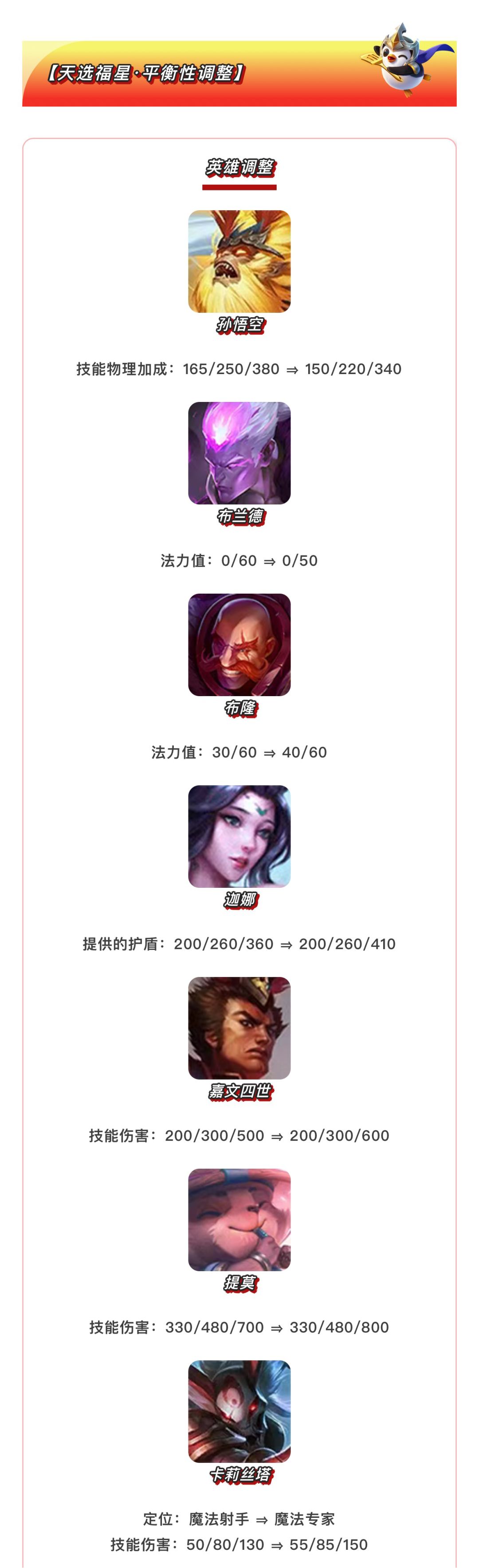 【天选福星】的调整将重点削弱“高天神”体系的生存能力,以控制其在当前环境中的统治力。对当前表现较弱的决斗大师、腥红之月和龙魂三大羁绊进行了集体加强。同时,嘉文四世、提莫、迦娜的三星强度也得到了提升,希望让这些二费英雄拥有更大的发挥空间。