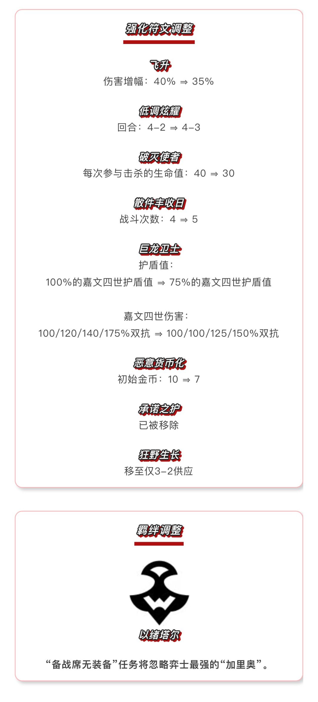 本次更新【英雄联盟传奇】秉承更精炼更稳妥更聚焦的原则,在英雄方面我们提升了可酷伯技能的自我治疗,使其能在战场上坚持更久;对于卡莎,我们增强了她物理形态的技能伤害;随着加里奥的解锁条件降低,这位英雄的出场优先级也随之提高,为此我们适度降低了他的耐久度,由于技能受益于双抗,这一改动也会同步影响他的表现。此外,我们还对部分在当前环境中表现过强的强化符文进行了强度下调,使其更契合整体对局节奏。