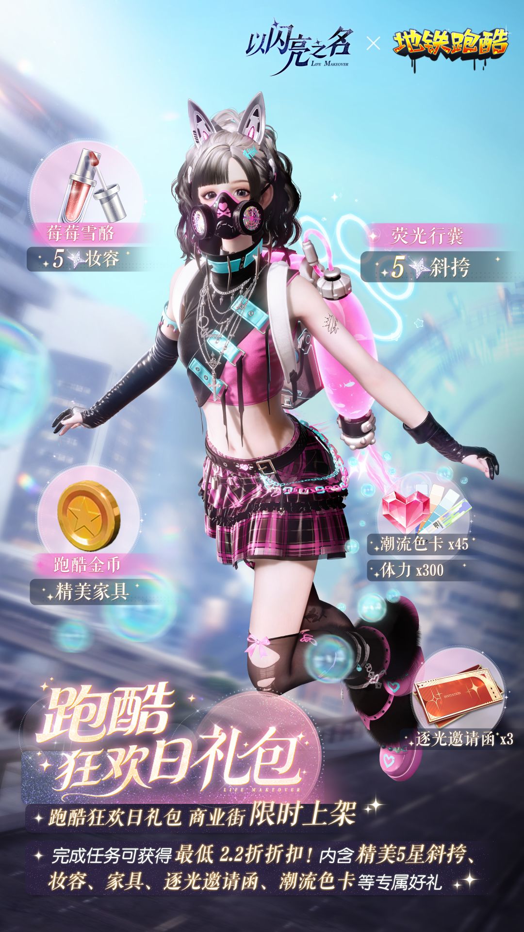 礼包售卖期间,合伙人可以完成限定任务获取礼包折扣。完成全部4个任务可降至最低折扣2.2折!超值优惠不容错过!礼包内含五星限定联动时装【荧光行囊】、五星妆容【莓莓雪酪】、联动家具【跑酷金币】、逐光邀请函*3、体力*300和潮流色卡*45,该礼包永久限购1次。