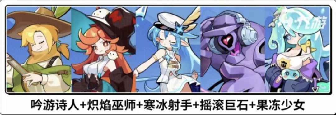 国家队阵容:吟游诗人 + 炽焰巫师 + 寒冰射手 + 摇滚巨石 + 果冻少女