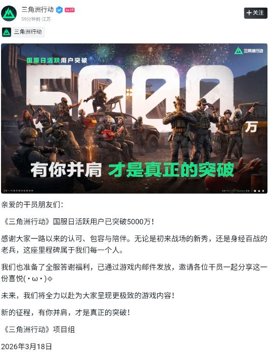 重磅里程碑!《三角洲行动》国服日活突破5000万,官方致谢玩家