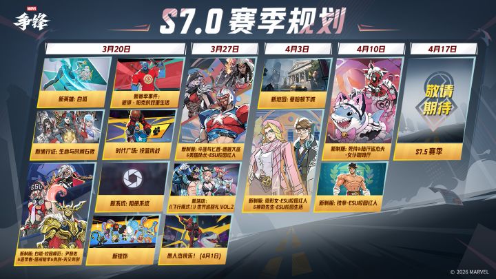 《漫威争锋》第7赛季将于3月20日正式上线!为方便大家了解赛季未来的更新节奏,我们在这里为各位带来了S7.0的赛季规划: