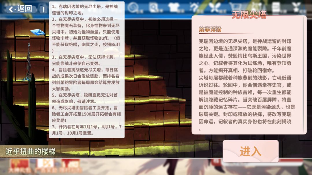 下来介绍下无尽尖塔玩法,无尽尖塔作为一个全新玩法,将于无尽深渊,遗迹领域并存,作为扩展游戏玩法的一种。
