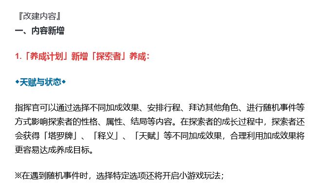 在全新版本养成计划中,玩家可通过安排行程、随机事件等方式影响探索者的性格属性和最终结局,过程中还能解锁各种加成效果。 养成结束后可选择继续挑战,或重新开始。