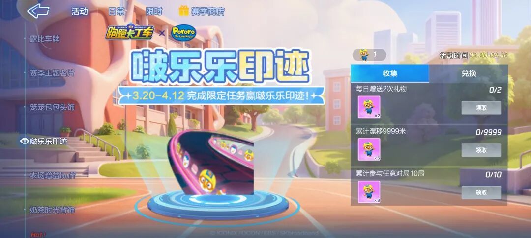 啵乐乐和他的小伙伴们,带着美味的小零食即将一同抵达繁荣山丘,在此之前先让赛道充满他们的足迹吧!3月20日起,完成限定任务即可免费兑换全新【啵乐乐印迹】,向繁荣山丘宣告一群小可爱即将到来!