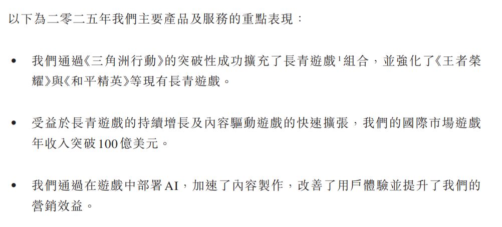 财报中表示,《三角洲行动》突破性成功扩充了公司长青游戏的组合。《王者荣耀》《和平精英》等长青游戏表现持续稳定。