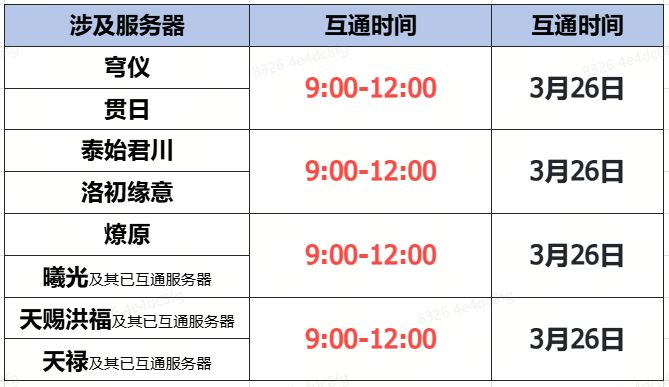 天禄服本周五(3月20日)10:00上架合服狂欢活动提升玩家等级,持续到3月26日凌晨5点结束;曦光服本周五(3月20日)10:00上架合服狂欢活动提升玩家等级,持续到3月26日凌晨5点结束;洛初服本周五(3月20日)10:00上架合服狂欢活动提升玩家等级,持续到3月26日凌晨5点结束;太古服本周五(3月20日)10:00上架合服狂欢活动提升玩家等级,持续到3月26日凌晨5点结束;