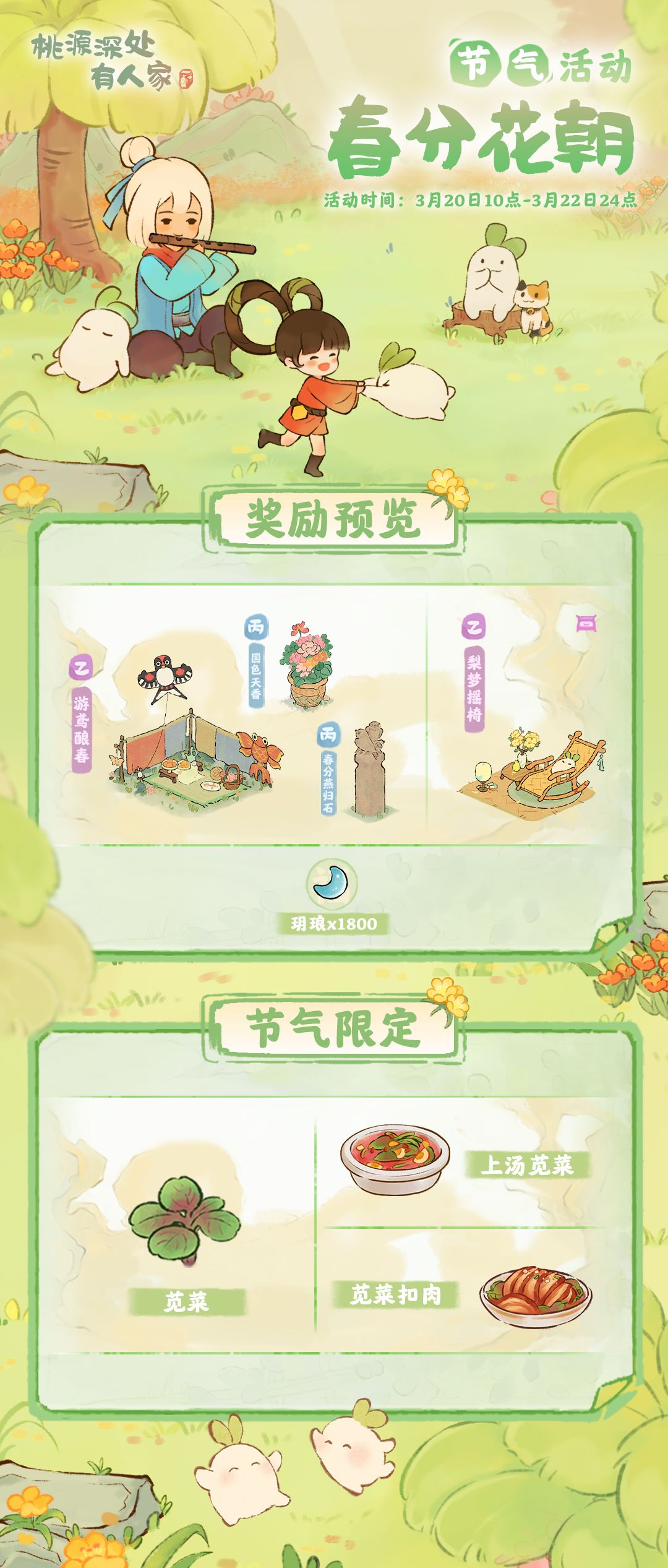 山民们在活动期间内,可种植「苋菜」和制作特殊节气菜品「上汤苋菜」和「苋菜扣肉」,完成节气订单可以获取玥琅。